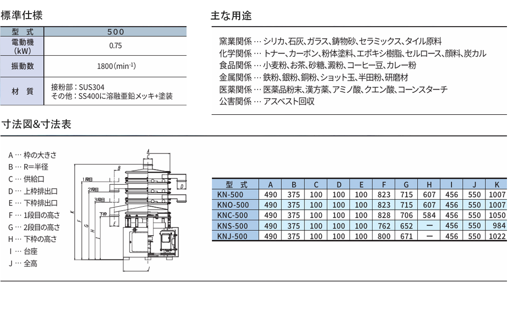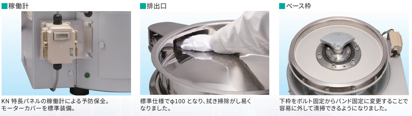 従来の標準型(KFシリーズ)と強力型(KGシリーズ)の振幅をこの1台で簡単に調整できる様になりました。上部ウエイト、下部ウエイト調整だけで振幅を変更可能です。投入原料や網の変更、生産量アップ、といった変化に対してこの1台で対応可能です。また、KNシリーズでは構成部品が統一されたことで、仕様変更時の部品交換点数が少なくなりました。本体の買替えや部品破棄を最小限にお使い頂けます。 KF/KGのハイブリッド! 状況に合わせて、振幅=能力を自由に調整可能! 安全性にも配慮! 製品特長: