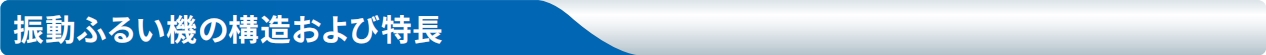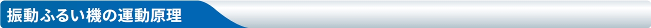 一般的にふるい分けの基本は、網を振動させることによって、原料の粒の大きさを選別したり、異物の除去を行います。振動ふるい機の運動原理は、モーターおよび振動体によって水平·垂直·斜めの動きを発生させ、網上の原料を効率よくふるい分けするものです。加えて、振動体に取りつけたウエイトの位相調整によって、ふるい面での原料の流れ具合を最適コントロールすることができ、ふるい分けの原料(粒度·比重等)に合わせた効率の良いふるい分けを可能にしています。