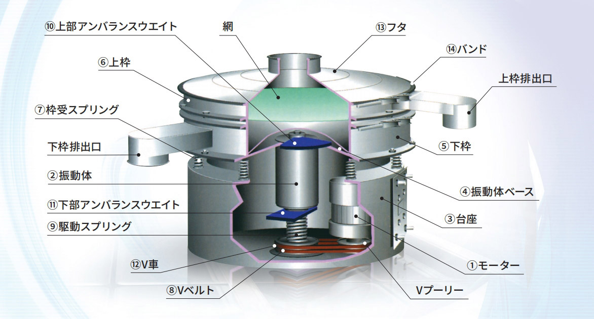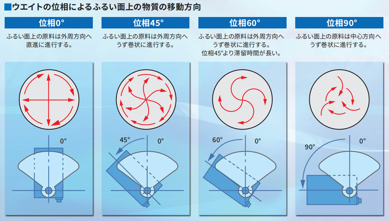 振動ふるい機は基本的に、ふるい面を中心にして振動するもので、その振動は振動体の両軸端につけたウエイトにより発 生するものです。上部アンバランスウエイトの回転は、ふるい面の水平振動発生させて、ふるい面の中心に供給された物質を回転方向に移動させる役目をします。下部アンバランスウエイトの回転は、ふるい面の垂直振動を発生させて外周方向に移動させる役目をします。つまりこれらの振動が合成されて、ふるい面に三次元運動を起こすわけです。上部アンバランスツエイトに対する下部アンバランスウエイトの位相を変えることにより、振動の性質が変化し、処理物の性状に適した運動を得ることができます。