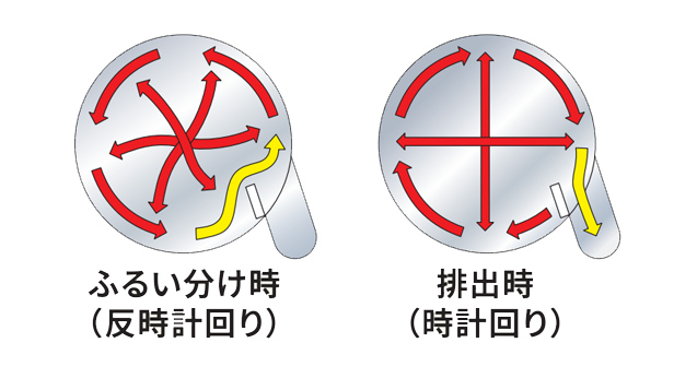 通常ではふるい機内の原料は、排出口に合わせて時計回りに流動してふるい選別されます。