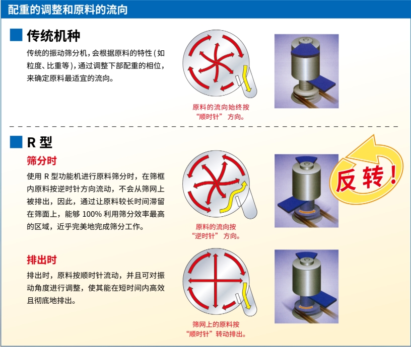 而在反转功能机中,能够在筛分和排出这两个阶段使原料的流动方向逆转。